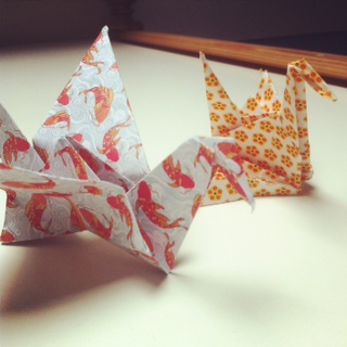 Danach konnten wir uns alle auf dem Boden bequem machen und zuhören. Das erste Märchen handelte über einen Kranich. Kraniche sind wahre Glücksbringer. In Japan ist es Brauch, wenn man z.B. krank ist und gesund werden möchte, oder einen besonderen Wunsch hat, muss man 1000 Kraniche falten. Der grosse Sohn hat mich dann auch schon sehr fordernd angeschaut. Ich befürchte, dass ich jetzt die Origamianleitung suchen muss und die nächsten Wochen, Kraniche falten werde.