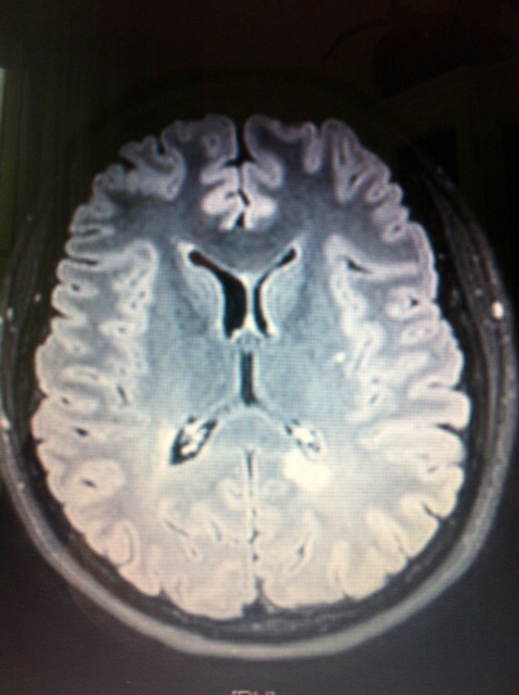 Bisher habe ich 5 erbsengrosse Schädigungen (rechts Mitte, im Bild) und 2 ca. 2.5cm Durchmesser (unten rechts im Bild). Die Läsionen leuchten weiss in der grauen Hirnmasse.