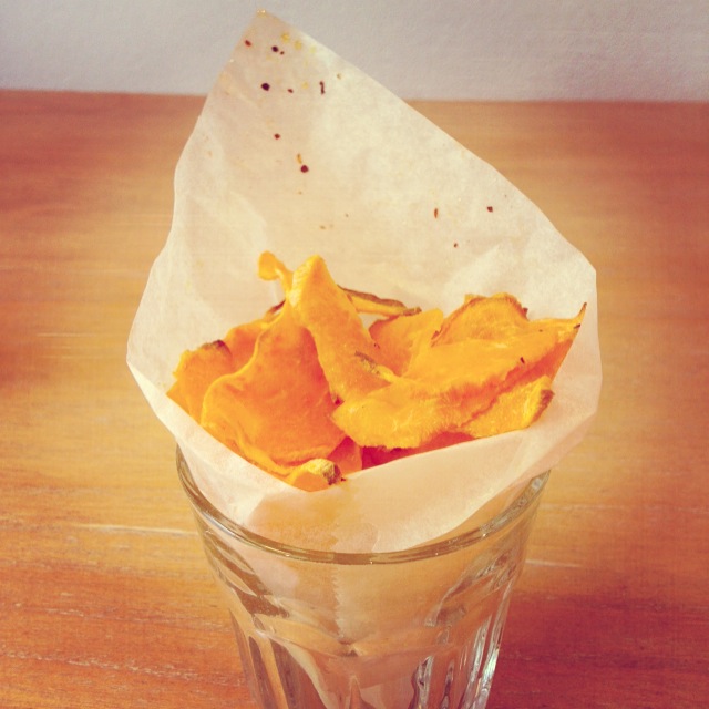 Ich habe Süsskartoffelchips gemacht. Die waren so lecker, dass sogar der kleine Sohn etwas davon probiert hat.