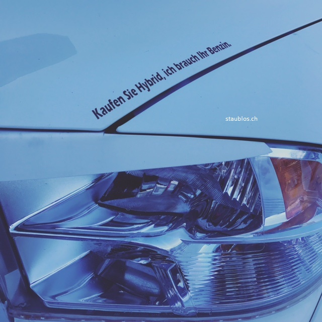 Am vierten Tag ging es dann aber auch schon wieder nach Hause. Ich hatte das Gefühl, wir würden kein Shuttle brauchen und holte das Auto. Weil ich doch so wahnsinnig schlau bin, nicht, fuhr ich das Auto die steile und vereiste Hoteleinfahrt rückwärts runter. Nachdem wir das Auto wieder randvoll geladen haben, kamen wir kein Stück weiter. Das Auto hatte keine Chance da wegzukommen. Also mussten wir Schneeketten montieren. Zum Glück hat eine junge Frau angeboten, uns zu helfen, weil sie gerade bei einem Kurs das lernen musste! Und so kamen wir tatsächlich wieder hoch. Vorher, noch auf dem Parkplatz beim Dorfeingang, musste ich sehr über dieses Auto lachen. Ein riesiger Amischlitten (Dodge) mit diesem Aufkleber. Naja, ich hätte es in diesem Moment gerne gehabt…Karma Baby.