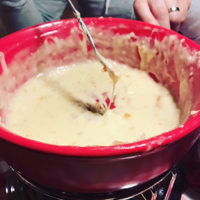 Unser Familienzimmer war hübsch. Es war eng aber ausreichend und ich hatte mich schon gefragt, wie lange es dauern wird, bis wir uns auf so kleinem Raum auf die Nerven gehen werden, schliesslich gab es überhaupt keine Ausweichmöglichkeiten. Die Sorgen waren aber unberechtigt, dazu weiter unten detailierter…Nachdem wir uns eingerichtet haben und das Dorf erkundet, ging es ins Hotelrestaurant. Zur Auswahl gab es Käse, Käse und Käse. Also haben Mann und ich ein Fondue bestellt und den Kids wurden leckere Kindermenüs angeboten. Ich sag’s so: Tod durch Fondue