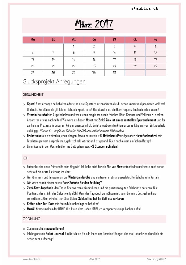 Es wäre ganz toll, wenn wir am letzten Tag des Monats einen Rückblick machen und uns fragen, was wir davon geschafft haben und ob es uns gefallen hat. Je nach dem entsteht aus dem Projekt eine kleine Gewohnheit die uns gut tut. Den Rückblick kann man in kurzen Stichworten, einem Blogpost oder mit Fotos hier verlinken (mit verlinken meine ich ein Pingback zu meinem Blog) oder auf Instagram #glücksprojekt2017 @staublos_ch verwenden, ansonsten kann ich es nicht sehen. Das Bild vom Glücksprojekt 2017 könnt ihr gerne mitnehmen. LeserInnen, die kein Blog schreiben, können natürlich jeweils unter meinem Post kommentieren und ein Foto hoch laden.