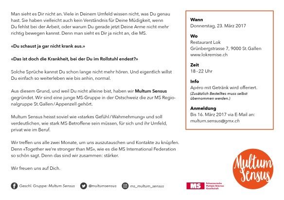 Letzte Woche fand unser 2. Multum Sensus Treffen in St. Gallen statt. Meiner Meinung nach, ein sehr gelungener Abend mit sehr spannenden, starken und lustigen Menschen. Unser Tisch war besetzt mit 13 Teilnehmern aus der Region Ostschweiz mit so vielen verschiedenen Lebensgeschichten. Solche, die schon seit 20 Jahren mit MS leben, solche die im Alter von 16 bzw. 19 Jahren die Diagnose bekommen haben oder die Diagnose letztes Jahr bestätigt bekamen. Die Einen, die eine MS-Therapie machen und solche, die keine Medikamente nehmen. Wir unterhielten uns querbeet und was soll ich sagen, stellt euch vor, MSler können sogar ein sehr ausgefülltes Leben leben! Das tönt sehr sarkastisch von mir, aber: wenn wir anschauen, was uns manchmal gesagt wird, wie z.B. unser Leben sein sollte mit MS, dann stimmt das meistens einfach nicht mit der Realität überein. Klar haben wir alle gewisse Einschränkungen die mehr oder weniger sichtbar sind, trotzdem machen wir das Beste daraus.