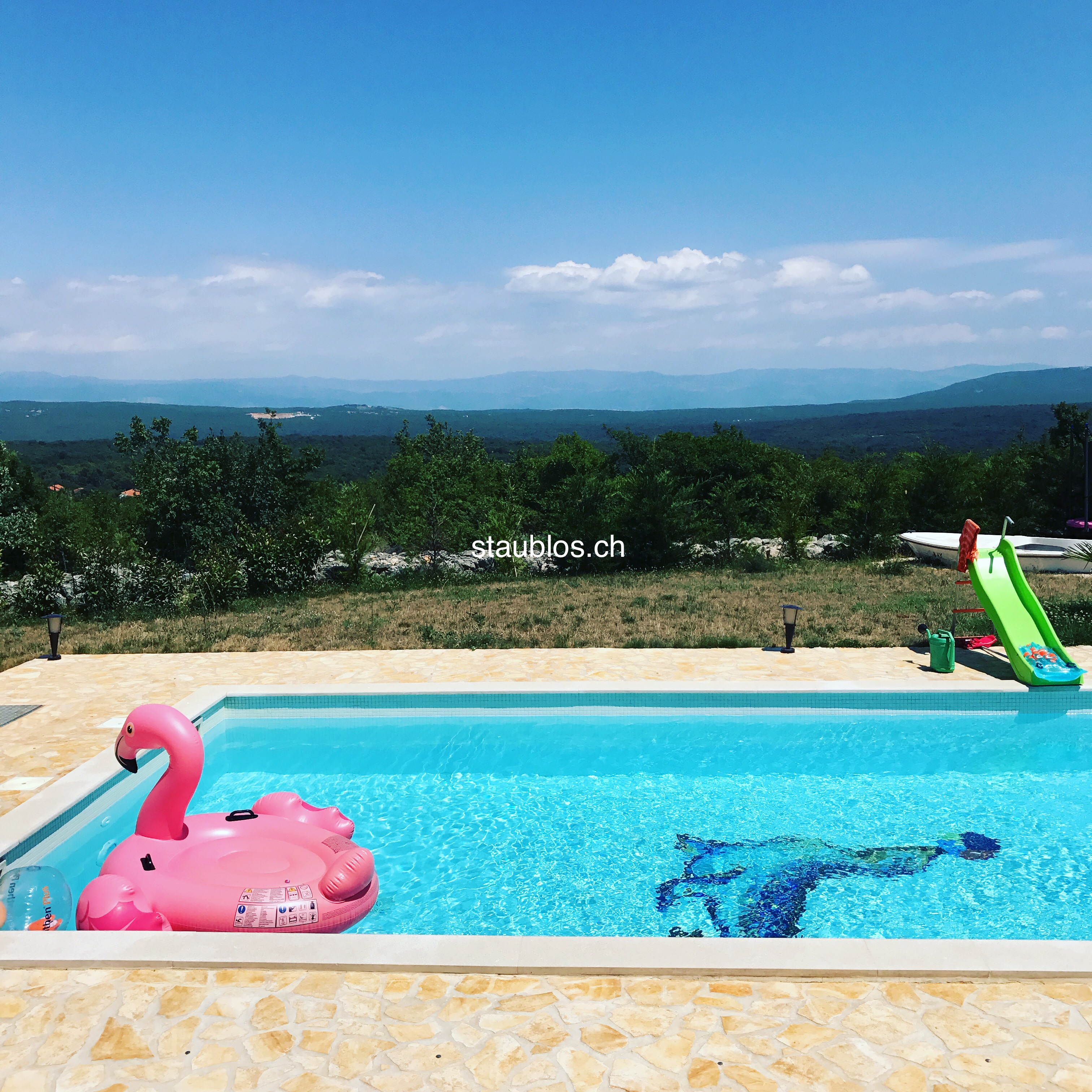 Dieses Jahr sind wir das erste Mal überhaupt mit einer anderen Familie mit Kindern verreist. Wir kennen uns seit über 15 Jahren und SIE ist eine meiner besten Freundinnen überhaupt. Wir waren alle mehrmals schon gemeinsam in den Ferien, aber noch nie mit allen Kindern zusammen. Man weiss ja nie, wie sich dann die gemeinsame Zeit so gestalten wird und ob Konflikte entstehen könnten. Wir haben also ziemlich kurzfristig, ja-ich war dafür verantwortlich, ein Ferienhaus gebucht. Unsere Bedingung war, es muss einen Pool und 4 Schlafzimmer haben. Da ich wie gesagt etwas spät dran war, waren die meisten Häuser mit Meerblick bereits ausgebucht. Unser Haus stand auf einem Hügel in einem klitzekleinen Dorf auf der Insel und hatte einen unglaublich weiten Blick über Felder und Hügel der Insel. Und, es war perfekt!